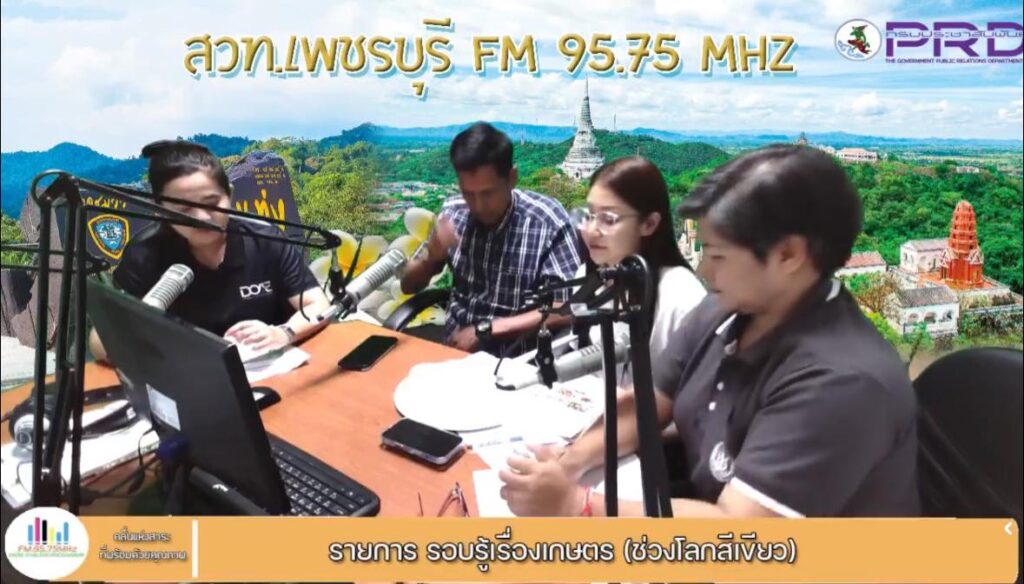 วันที่ 2 มีนาคม 2569 นางสาวกัลยรัตน์ สอาดนัก นักวิชาการส่งเสริมการเกษตรชำนาญการ นางรัฐยา ชายศรี นักวิชาการส่งเสริมการเกษตรชำนาญการ และนางสาววรรณฉัตร วิเชียรฉาย นักวิชาการส่งเสริมการเกษตรชำนาญการ กลุ่มอารักขาพืช สำนักงานเกษตรจังหวัดเพชรบุรี จัดรายการรอบรู้เรื่องเกษตร ช่วงโลกสีเขียว ออกอากาศทุกวันจันทร์ – ศุกร์ เวลา 10.10 น. – 11.00 น. ทางคลื่น FM 95.75 MHz สถานีวิทยุกระจายเสียงแห่งประเทศไทย จังหวัดเพชรบุรี โดยมีประเด็นในเรื่องการประชาสัมพันธ์การขึ้นทะเบียนเกษตรกร มาตรการป้องกันและแก้ไขปัญหาการเผาในพื้นที่เกษตรกรรม และการจัดการแปลงชมพู่เพชรสายรุ้งแบบผสมผสาน โดยมีนายนิพนธ์ สิงห์สังข์ ประธานกลุ่มแปลงใหญ่ผู้ปลูกชมพู่เพชรสายรุ้ง ตำบลบ้านกุ่ม อำเภอเมืองเพชรบุรี จังหวัดเพชรบุรี ร่วมดำเนินรายการ